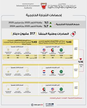أصدرت هيئة المعلومات والحكومة الإلكترونية تقريرها الأولي لإحصاءات التجارة الخارجية عن شهر أكتوبر من عام 2025، حيث يشتمل التقرير على بيانات الواردات والصادرات وطنية المنشأ وإعادة التصدير، بالإضافة إلى الميزان التجاري.